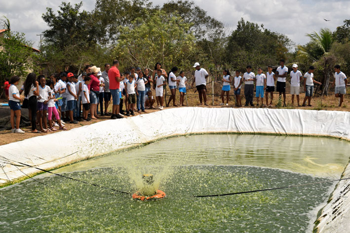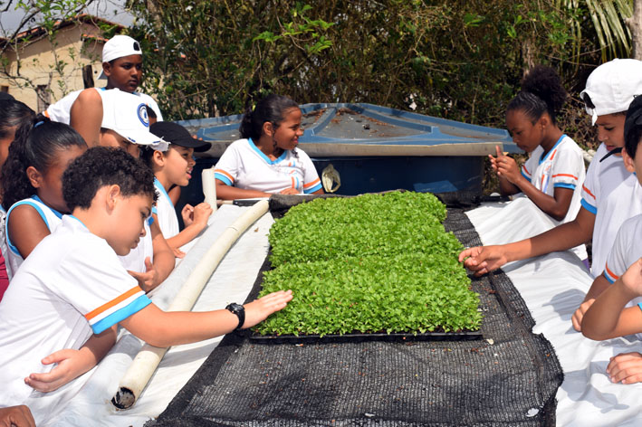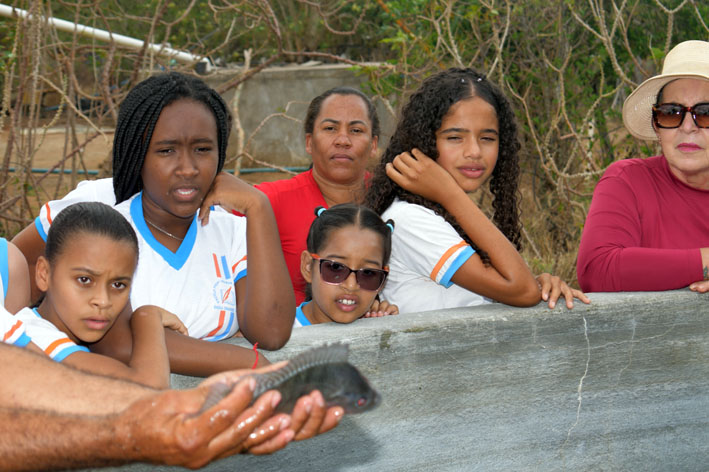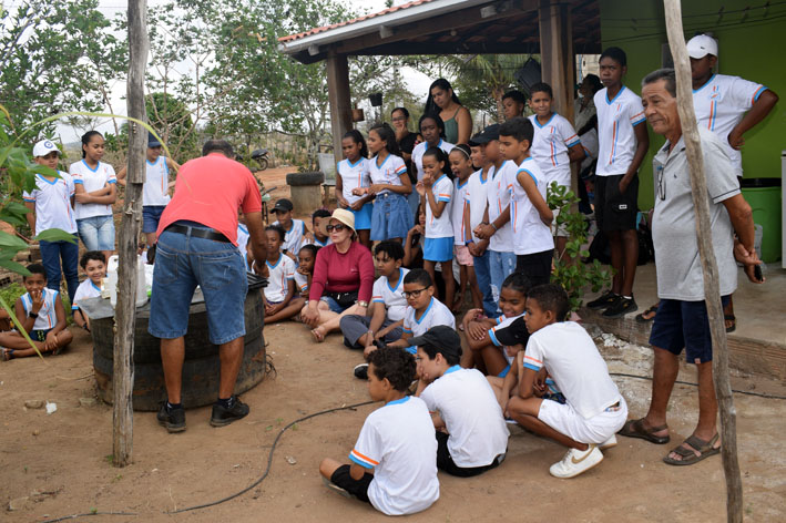 Além do cultivo de hortaliças, Jurandir também desenvolve a piscicultura em sua propriedade. Os estudantes conheceram várias etapas da criação de peixes de pequeno e médio porte, como o pirarucu, um peixe nativo da Amazônia que pode atingir até 2 metros de comprimento e pesar até 150 kg.