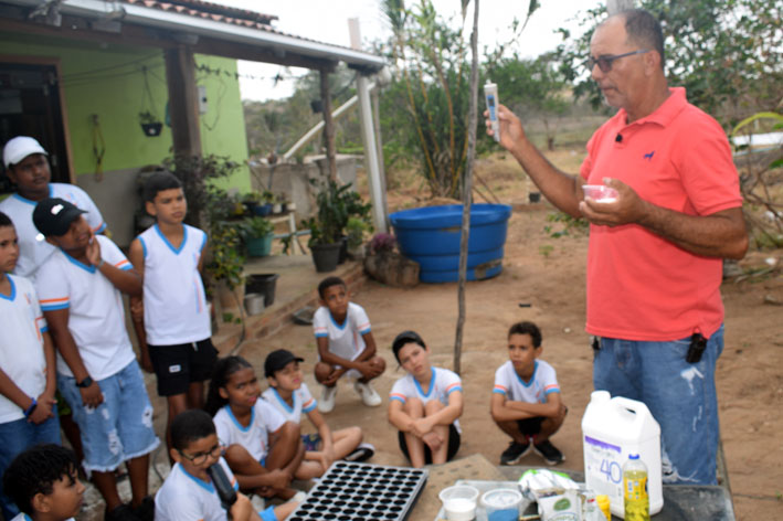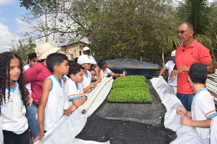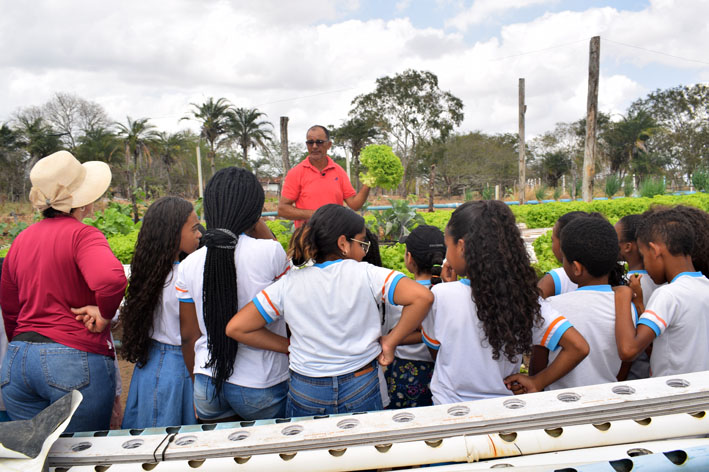 Jurandir é produtor de hortaliças, com ênfase no cultivo de alface e coentro por meio da técnica da hidroponia — método de cultivo sem uso do solo. Durante a visita, ele explicou aos estudantes todas as etapas do processo: desde o plantio das sementes, o período de germinação, os cuidados necessários até a colheita.
