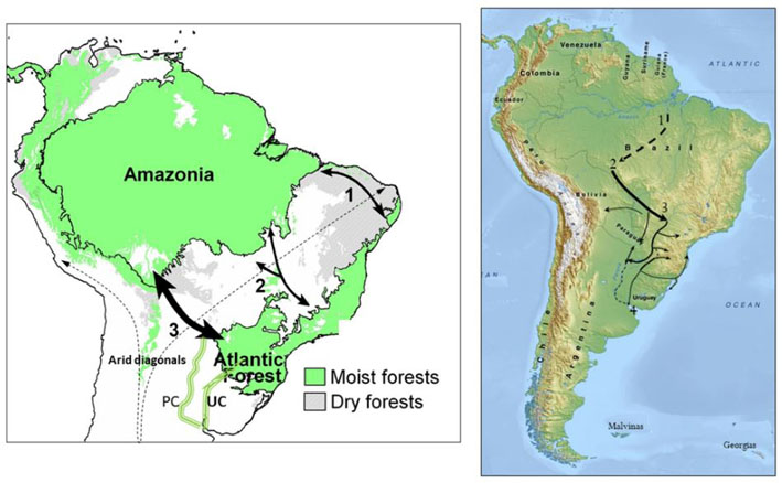 3) À esquerda: principais corredores naturais de conexão entre a Amazônia e a Mata Atlântica. 1 = rota nordestina. 2 = rota central. 3 = rota sudoeste. PC = Corredor do Sul do Paraná. UC = Corredor do Uruguai (adaptado de Machado et al. 2021 e www.conexoesamazonicas.org). À direita: visão geral da expansão territorial ao sul da família linguística tupi-guarani, desde o baixo rio Xingu (1) até o sudoeste da Amazônia (2), as nascentes da Bacia do Prata (3) e o rio da Prata (4). Crédito da imagem – LOPONTE, Daniel e coautores (2025).