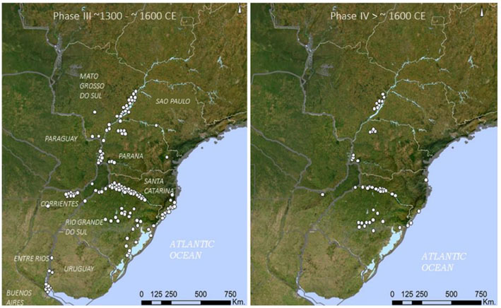 4) Distribuição dos sítios arqueológicos guarani datados incluídos na Fase III (à esquerda) e na Fase IV (à direita). Crédito da imagem – LOPONTE, Daniel e coautores (2025).