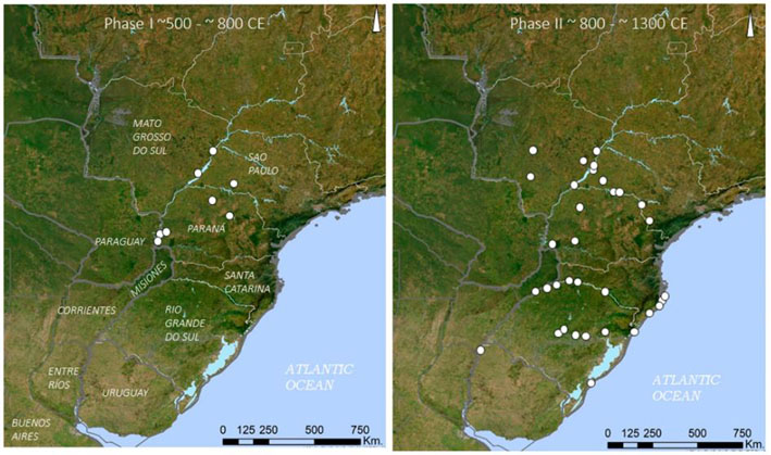 A segunda fase se estende entre os anos de 800 d.C a 1300 d.C, refletindo um ligeiro aumento de sítios em comparação a fase anterior, e uma significativa expansão territorial, quando esses povos passaram a habitar territórios que hoje correspondem a Santa Catarina e o Rio Grande do Sul, incluindo a Costa Atlântica.