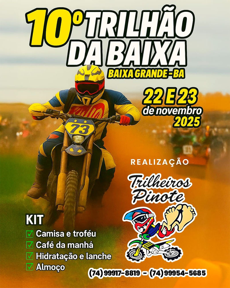 Criado em julho de 2011, o Trilhão na Baixa chega à sua 10ª edição em grande estilo. O evento será realizado nos dias 22 e 23 de novembro, em Baixa Grande, e promete literalmente “sacudir o chão” com a presença de trilheiros vindos de diversos municípios da região.