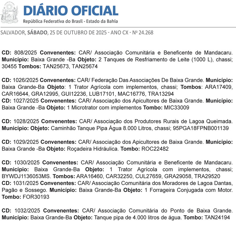 Foi publicada no Diário Oficial do Estado da Bahia, edição deste sábado, 25 de outubro de 2025, a relação de oito associações comunitárias de Baixa Grande que serão contempladas com implementos agrícolas e equipamentos por meio da Companhia de Desenvolvimento e Ação Regional (CAR).