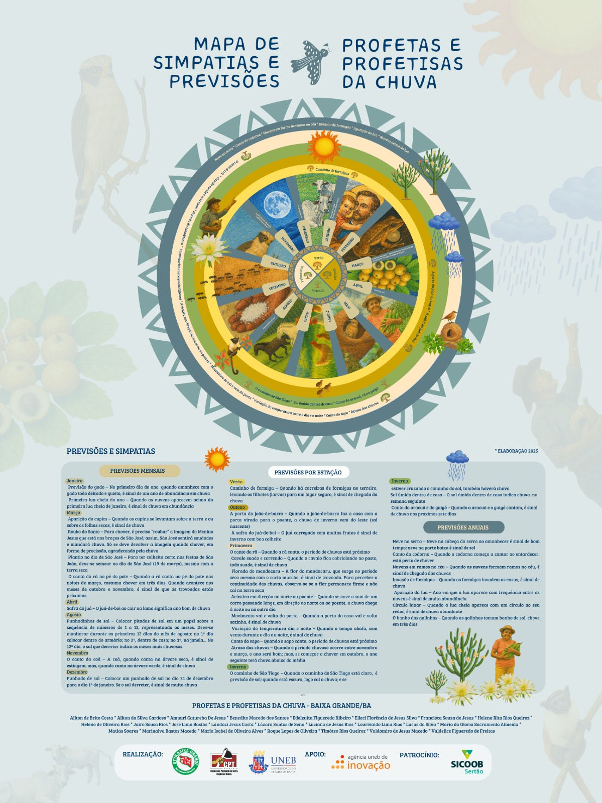 O Mapa de Simpatias e Previsões sintetiza o conhecimento popular de agricultores e agricultoras conhecidos como “Profetas e Profetisas da Chuva”. Organizado em forma de círculo, o mapa está dividido em meses e estações do ano, apresentando as principais previsões climáticas, sinais da natureza e simpatias rurais observadas nas comunidades da região.