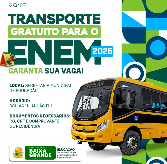 Nos dias 09 e 16 de novembro, a Prefeitura de Baixa Grande, por meio da Secretaria Municipal de Educação, disponibilizará transporte gratuito para os estudantes que irão participar do Exame Nacional do Ensino Médio (ENEM).