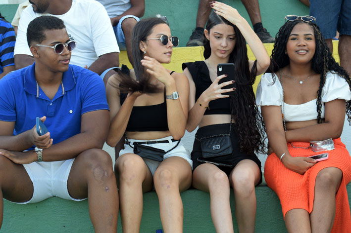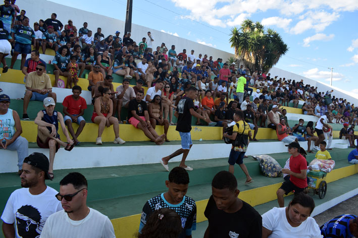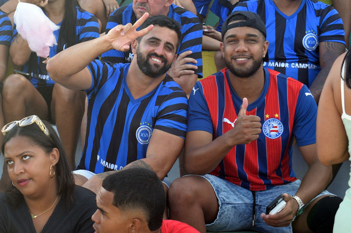 Mesmo levando 2 a 0, a torcedora Larissa, da Lagoa do Mamão, continuava acreditando numa virada milagrosa: “Vai ser 3 a 2 pra nós”, disse confiante. Do outro lado, Tamires, torcedora do Baixa Grande JR, tava toda feliz com a evolução do time.