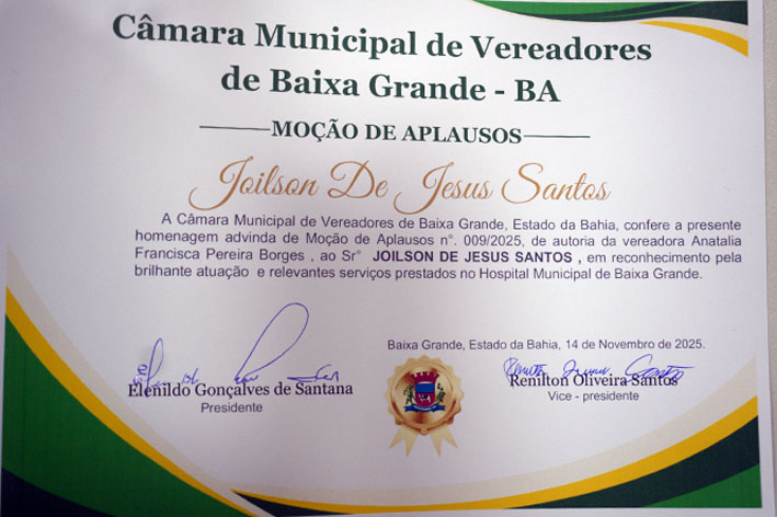 A Câmara de Vereadores de Baixa Grande entregou, na sessão da última sexta-feira (14), uma Moção de Aplauso ao servidor Joilson de Jesus Santos, conhecido como Joilson do Hospital. A homenagem foi proposta pela vereadora Anatália Borges (Naty), que destacou o comprometimento e a trajetória do servidor no Hospital Miltom Pamponet Ribeiro.