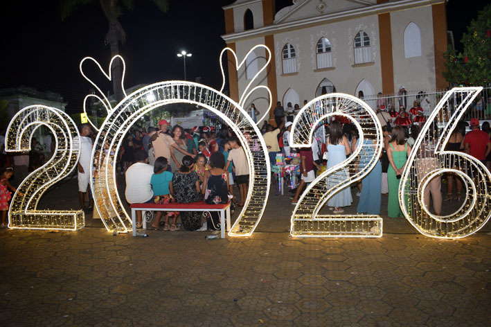 Em um dos lados da praça foi montada uma grande estrutura com a mensagem “Feliz Ano Natal”, enquanto no calçadão em frente à Igreja Matriz destaca-se o número 2026 iluminado.