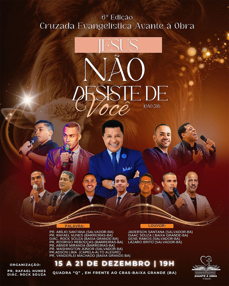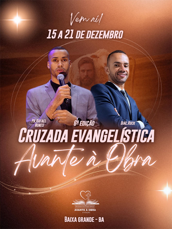 Tem início nesta semana, em Baixa Grande, a 6ª edição da Cruzada Evangelística, evento religioso que contará com sete dias consecutivos de pregações e ministrações. A programação acontece no mês de dezembro e reúne fiéis de diversas denominações evangélicas.