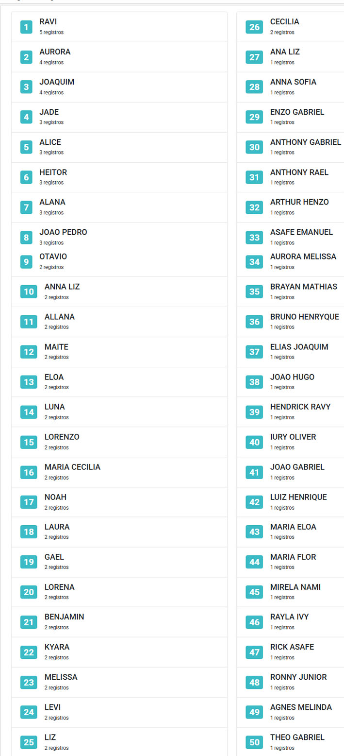 Entre os nascimentos registrados, o nome Ravi apareceu no topo da lista, com 5 registros, seguido pelos nomes Aurora e Joaquim, que obtiveram 4 registros cada.