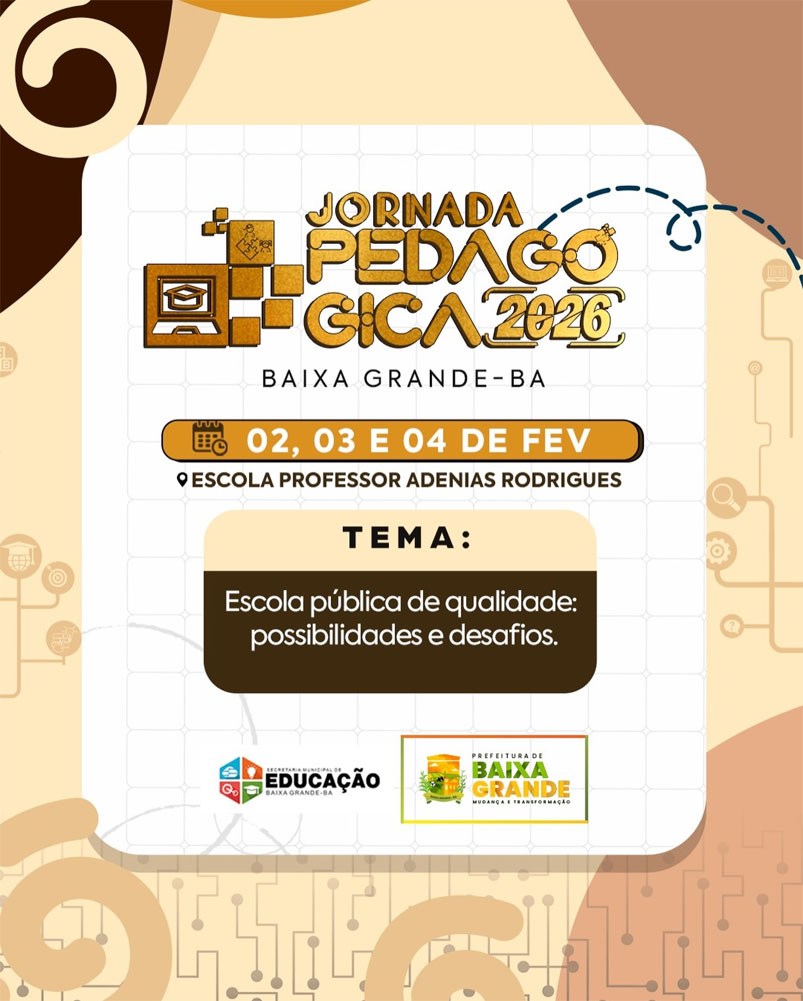 Na próxima segunda-feira, dia 2 de fevereiro, a rede municipal de ensino de Baixa Grande dará início ao ano letivo com a realização da Jornada Pedagógica 2026. O evento é voltado para o corpo docente das escolas públicas municipais e terá duração de três dias.