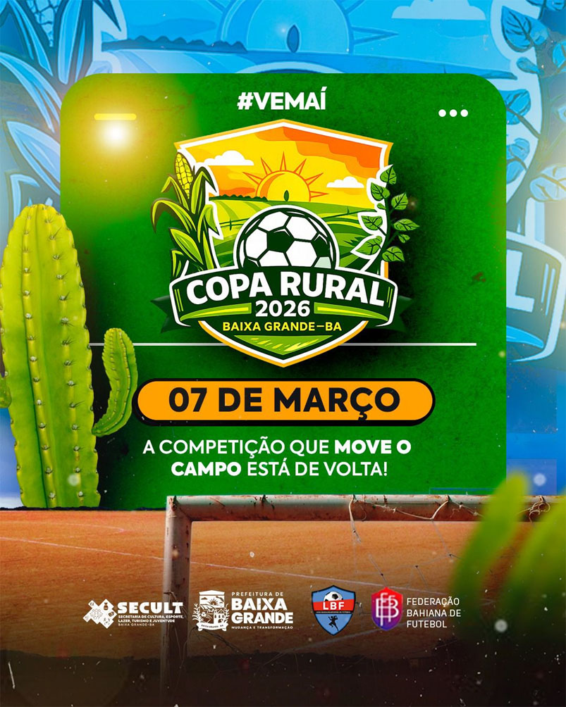 A Copa Rural 2026 é uma realização da Prefeitura de Baixa Grande, por meio da Secretaria de Cultura, Esporte, Lazer, Turismo e Juventude (SECULT), com organização da Liga Baixagrandense de Futebol (LBF).