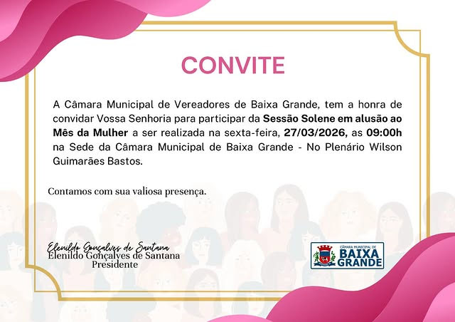 A Câmara de Vereadores de Baixa Grande realizará, na próxima sexta-feira, 28 de março, uma Sessão Solene dedicada ao Mês da Mulher, celebrado ao longo de todo o mês de março.