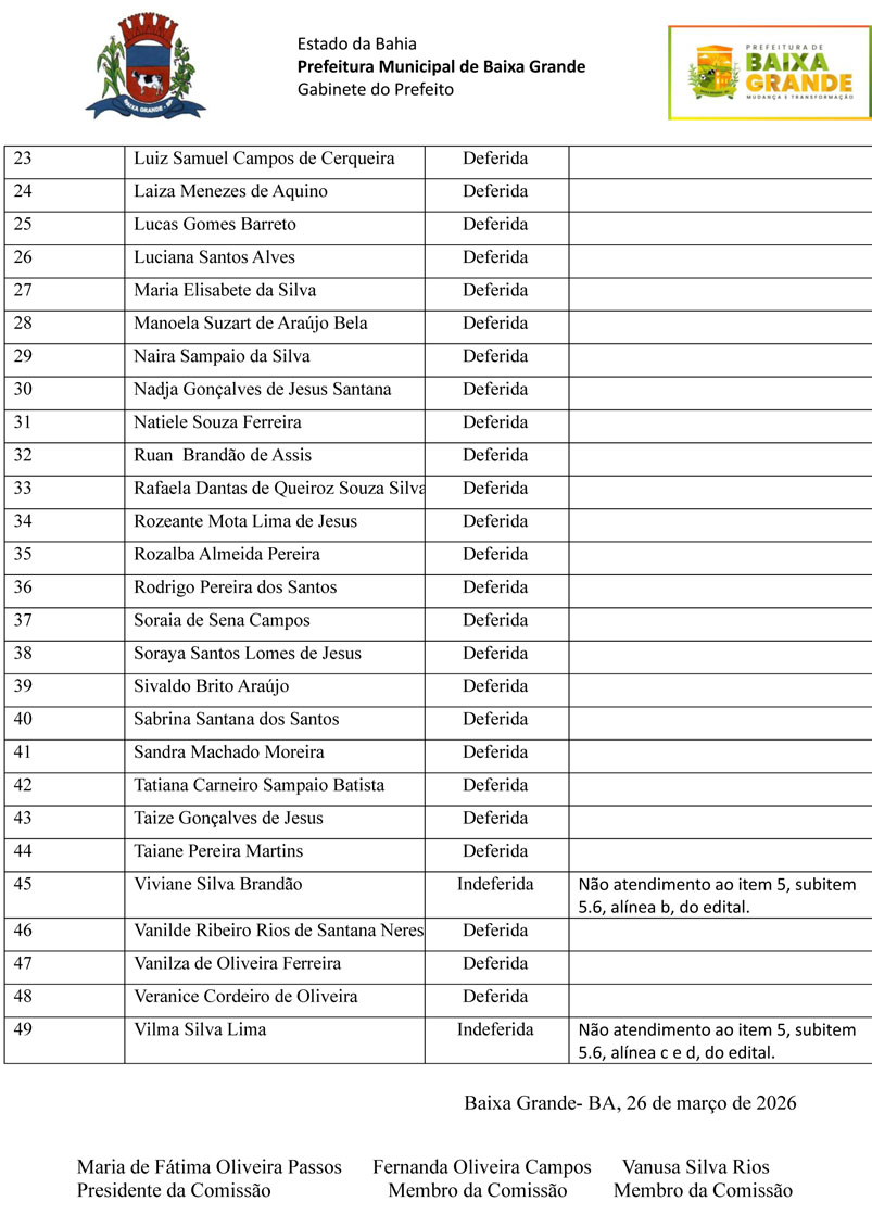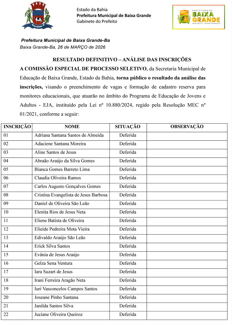 A Prefeitura de Baixa Grande publicou no Diário Oficial desta quinta-feira, 26 de março de 2026, o resultado da análise das inscrições do processo seletivo para monitores educacionais que atuarão no Programa de Educação de Jovens e Adultos (EJA).