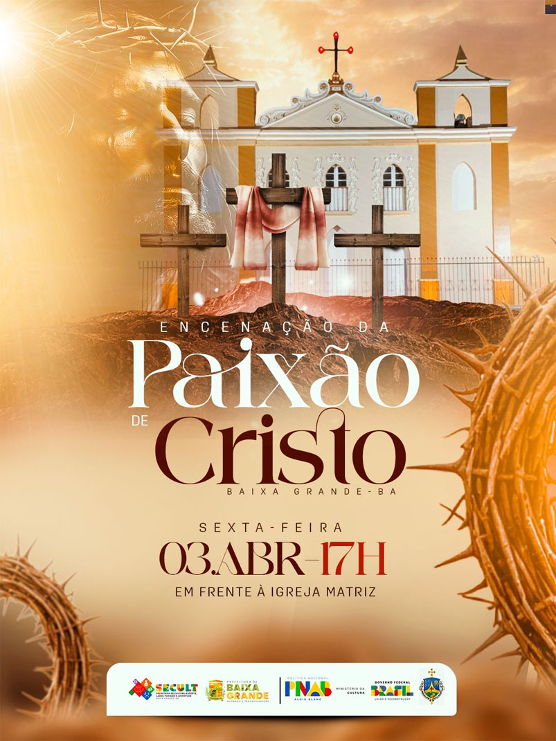 Nesta sexta-feira, dia 03 de abril, às 17h, em frente à Igreja Matriz, acontecerá a emocionante encenação da Paixão de Cristo. Um espetáculo de fé, reflexão e tradição que promete tocar o coração de todos.