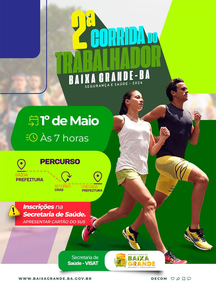 No dia 1º de maio, a partir das 7h da manhã, será realizada a tradicional Corrida do Trabalhador em Baixa Grande, um momento especial de incentivo à prática de atividades físicas e valorização de todos os trabalhadores que contribuem diariamente para o desenvolvimento do município.